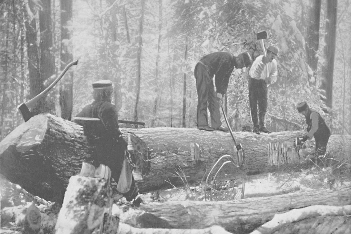 … um Holz. Kanadas Holzfäller, unsterblich gemacht durch „Monty Pythons“ „Lumberjack Song“, rücken den Urwäldern seit dem 17. Jahrhundert zu Leibe. Im 19. Jahrhundert gewann neben der Papierproduktion im Inland der Export nach England an Bedeutung. Als dieses Bild 1897 entstand, hatte sich die Forstwirtschaft längst von der Ostküste weit ins Landesinnere vorgearbeitet. Heute ...