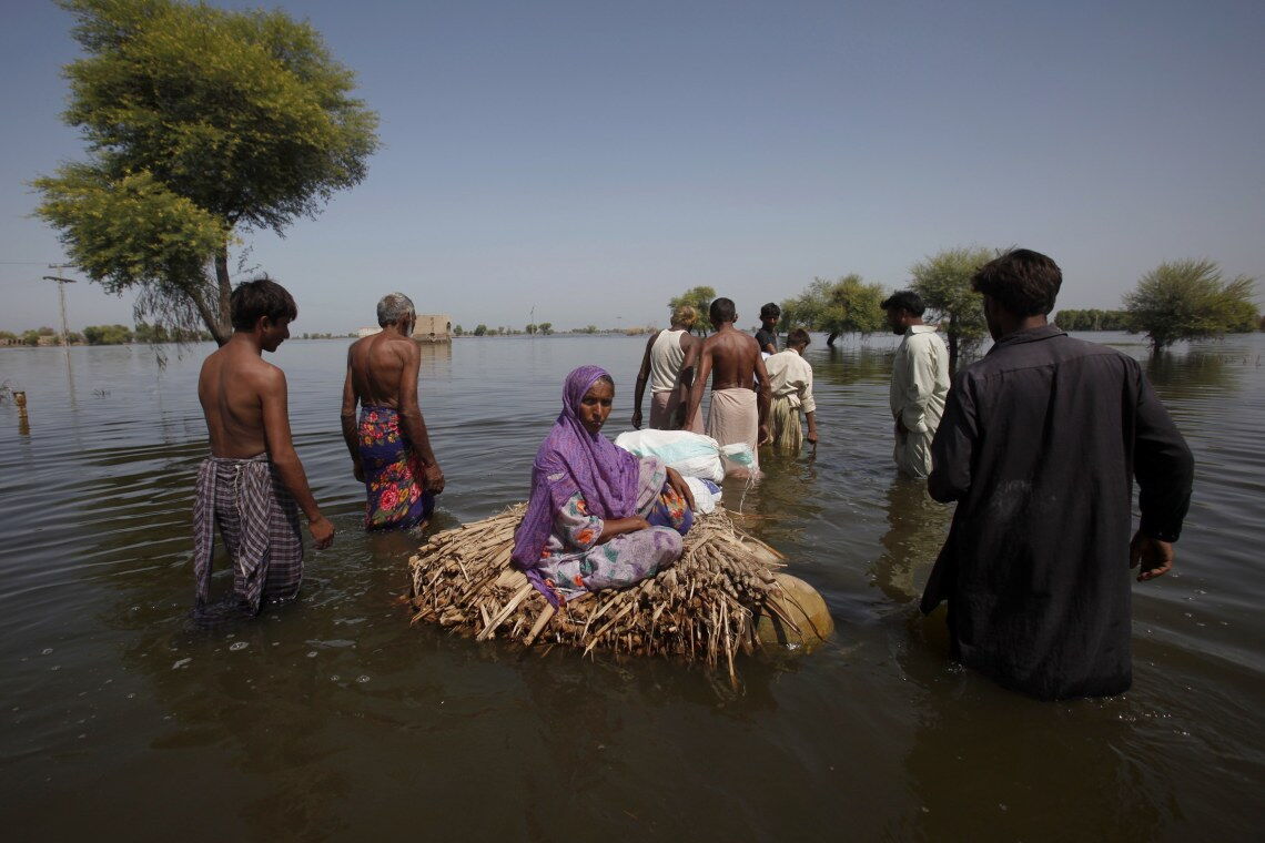 Auf einem notdürftigen zusammengesetzten Floß bringen Angehörige diese Frau in Pakistan aus ihrem überfluteten Dorf. Im Oktober 2010 stehen nach Regenfällen weite Landstriche unter Wasser. Mit der Erderwärmung dehnen sich die Regionen, die unbewohnbar werden, immer weiter aus.
