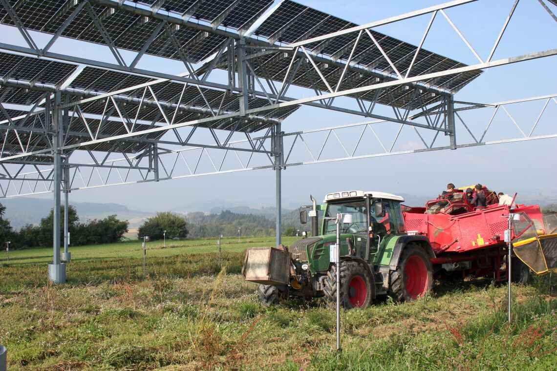2500 Quadratmeter misst die Anlage. Darauf sind 720 Fotovoltaikmodule in weiten Abständen zueinander verbaut. Das Besondere: Die Module stehen nicht direkt auf dem Feld, sondern hängen acht Meter hoch über dem Boden. Agri-Fotovoltaik nennt sich die Technologie, nach alter Rechtschreibung Agri-PV abgekürzt. Sie soll eines der drängendsten Probleme der Energiewende lindern: die Flächenknappheit. Landwirtschaft, Stromerzeugung, Siedlungen, Straßen, Arten- und Naturschutz – sie alle brauchen Platz. Doch der lässt sich nicht vermehren. Die Mehrfachnutzung von Flächen könnte einen Ausweg bieten. Im Fall von Florian Reyer heißt das: Unten sät er Kartoffeln und Getreide, oben sammeln Kollektoren die Energie der Sonne.